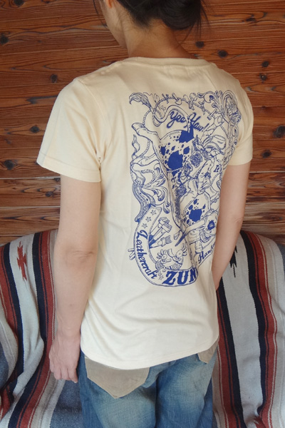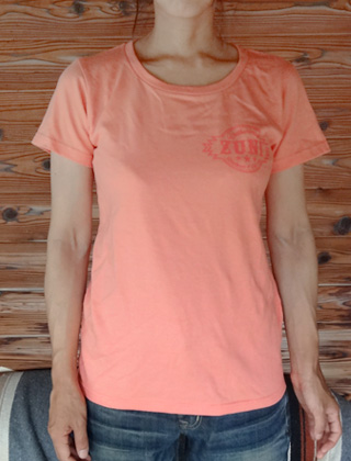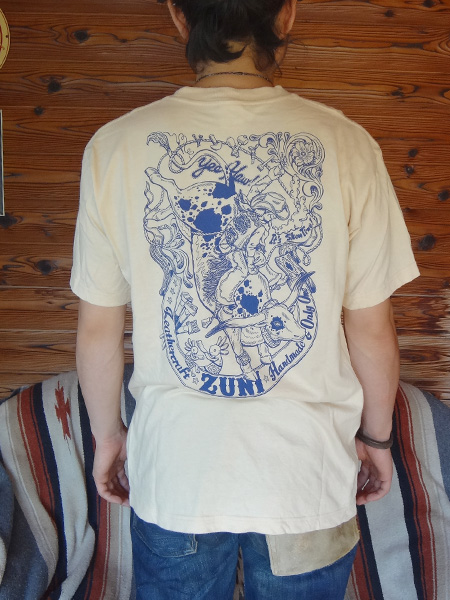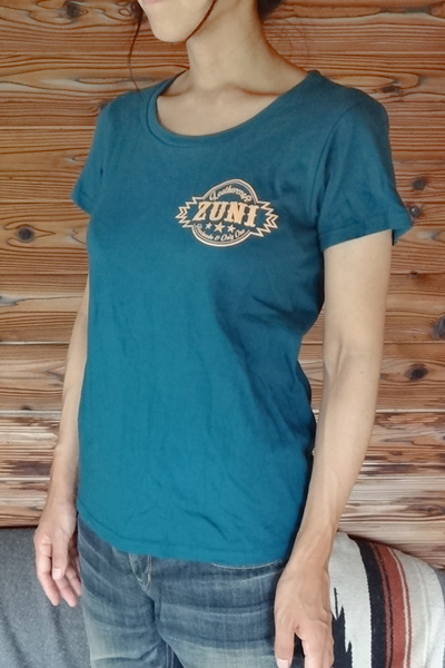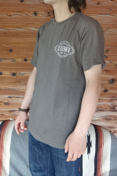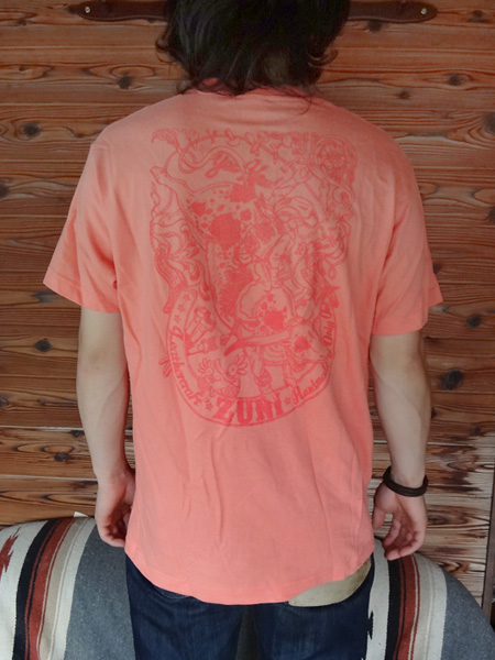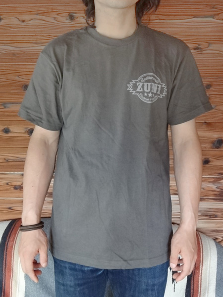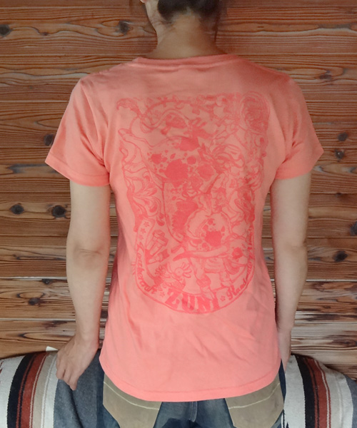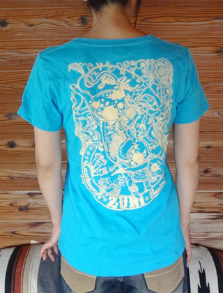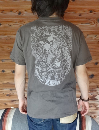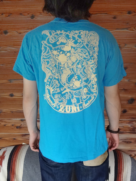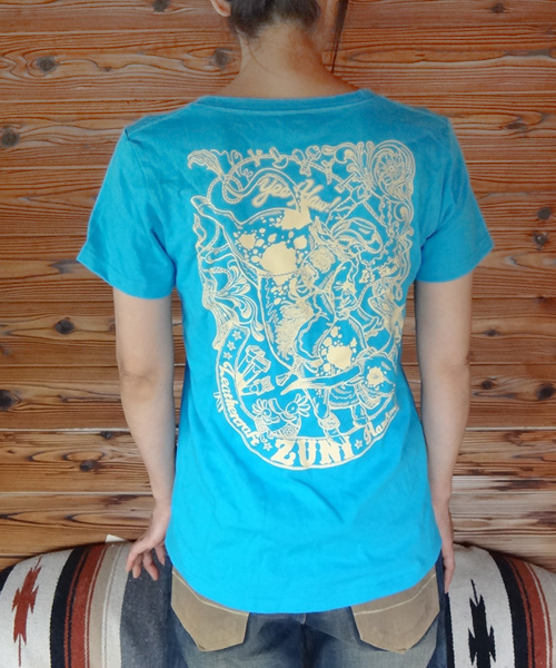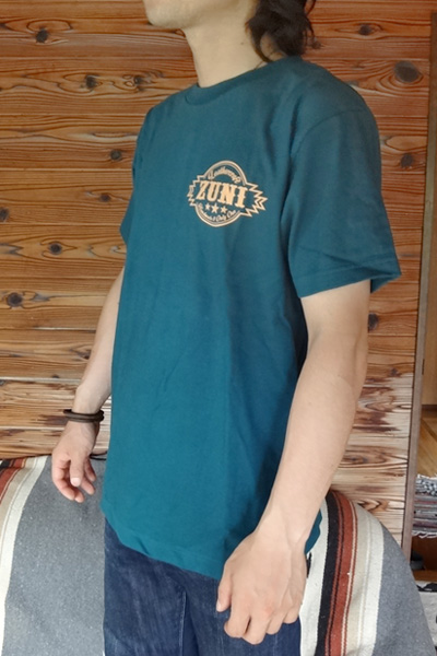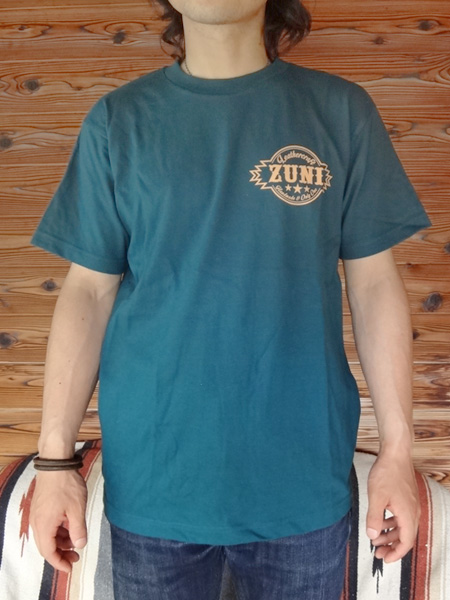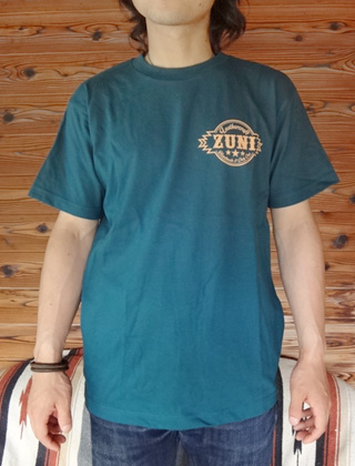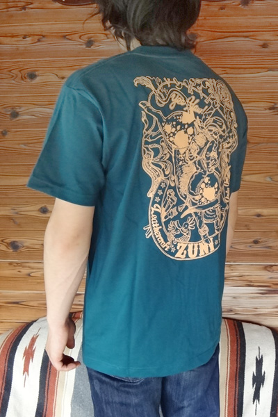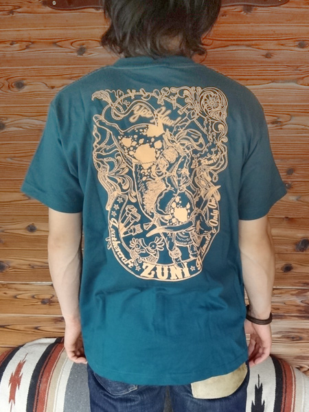 ■Tシャツ 5.6オンスの程よい厚みのプリントスター製オリジナルTシャツ。サイズはメンズのS・M・Lと、レディースのS・M・Lの6サイズ。 カラーはチャコール・エメラルド・ターコイズ・ライトオレンジの4カラー。左胸箇所にZUNIオルテガロゴ。背面は「ウエスタン& レザークラフト」をテーマに、迫力あるロデオシーンを革細工で用いるツール、唐草、ココペリなどで彩り、ZUNIならではのデザ インに仕上げました。