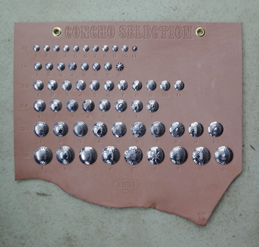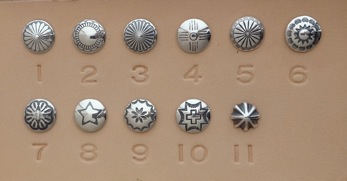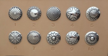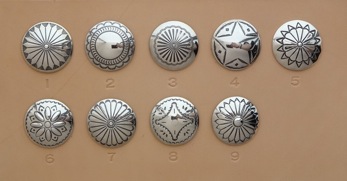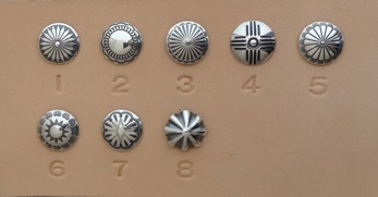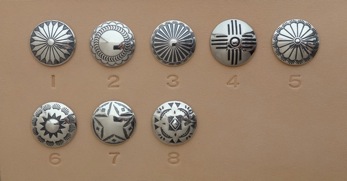 シルバー925コンチョ サイズ6種類 全57パターン ・12サイズ全11パターン ¥750+tax/1ヶ(取り付け費込) ・16サイズ全8パターン ¥900+tax/1ヶ(〃) ・20サイズ全11パターン ¥1250+tax/1ヶ(〃) ・24サイズ全8パターン ¥1800+tax/1ヶ(〃) ・30サイズ全10パターン ¥2650+tax/1ヶ(〃) ・35サイズ全9パターン ¥3800+tax/1ヶ(〃) ジャンパーホックの替わりに取り付ける事が出来ます。 12サイズは直径12mmを表しており、他のサイズも同様です。 サイズの参考はギャラリーのコンチョを取り付けている作品に コンチョサイズも表記しておりますので、ご確認下さい。 希望されるコンチョは、サイズと番号を申し付け下さい。 また、持ち込みのコンチョでもサイズが合う様でしたら お取り付けする事も出来ます。
