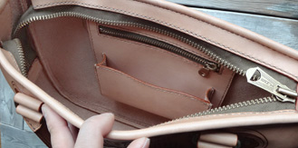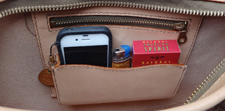 鞄内の別ポケットでは、携帯やタバコなど収めるスペースと、 ファスナーの中に鍵など紛失し易い物を収める事も出来ます。
